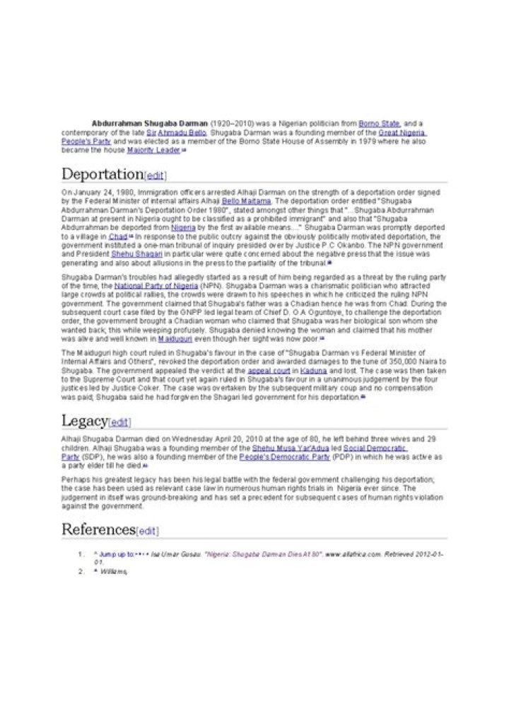 The Maiduguri high court ruled in Shugaba’s favour in the case of “Shugaba Darman vs Federal Minister of Internal Affairs and Others”, revoked the deportation order and awarded damages to the tune of 350,000 Naira to Shugaba. The government appealed the verdict at the appeal court in Kaduna and lost. The case was then taken to the Supreme Court and that court yet again ruled in Shugaba’s favour in a unanimous judgement by the four justices led by Justice Coker. The case was overtaken by the subsequent military coup and no compensation was paid; Shugaba said he had forgiven the Shagari led government for his deportation.