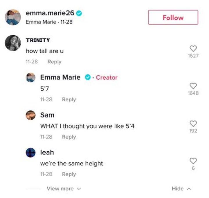 How tall is Emma Marie? Emma Marie is 5 feet 7 inches tall.